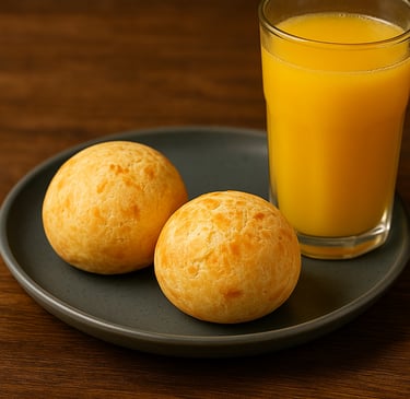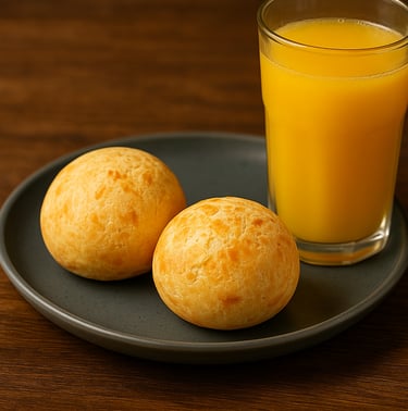 Deliciosos pães de queijo brasileños, con un jugo natural recién hecho.
