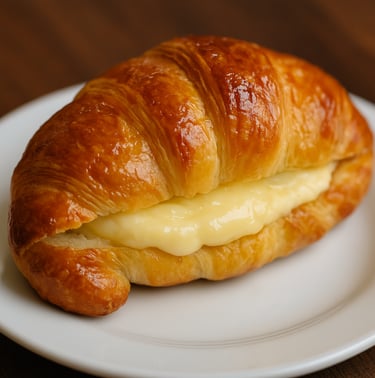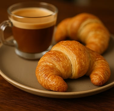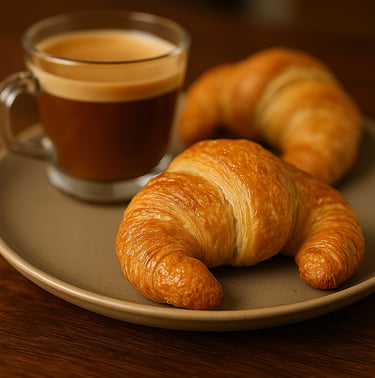 Dos medialunas recién horneadas, doraditas y suaves, acompañadas de un cortado o té.