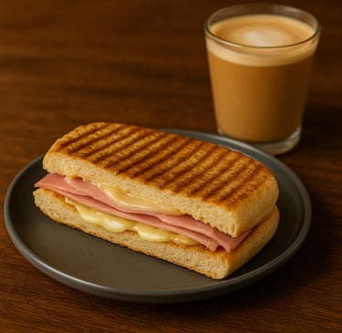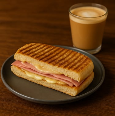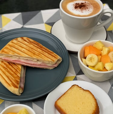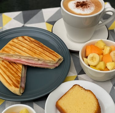 Capuccino,chocolate caliente o té, Prensado de jamón y queso,Queque casero,Porción de frutas frescas