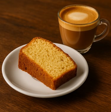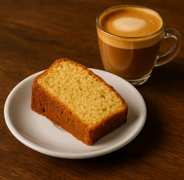 nuestro queque casero, hecho con ingredientes naturales y sin lactosa, acompañado de un cortado o té recién preparado.