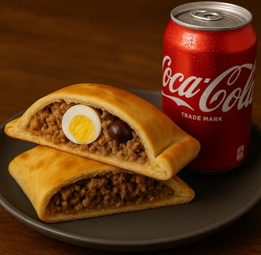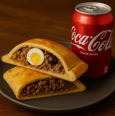 Empanada chilena de horno, rellena de carne picada con cebolla, huevo y aceituna, acompañada de una Coca Cola helada.