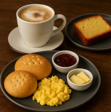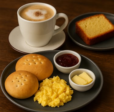 Cortado o té, huevos revueltos con pan amasado y Queque casero