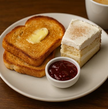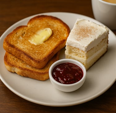 Cortado o té mas Tostadas con mantequilla y mermelada Queque o torta del día